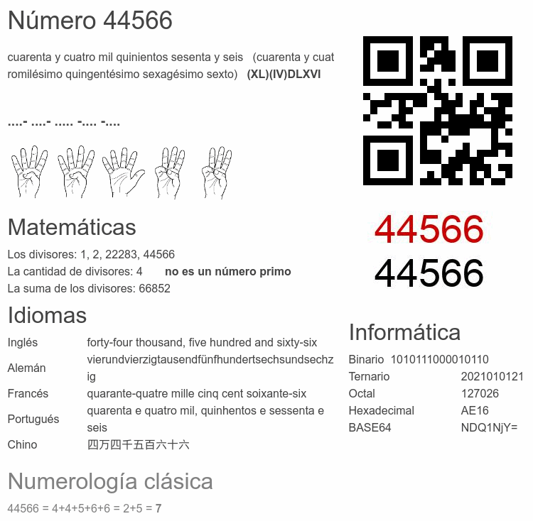 Si conoce algo interesante sobre el número 44566 o cualquier número natural (entero positivo), por favor escríbanos.Número 44 566 en otras unidades