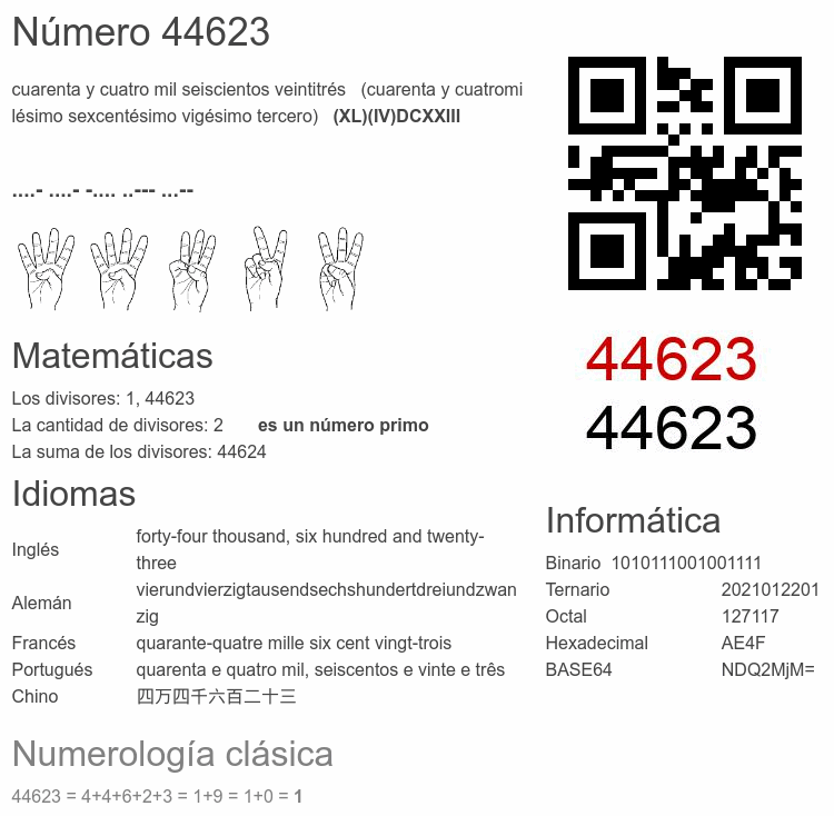 El número impar 44 623 se dice 🔊, y se escribe con las palabras: cuarenta y cuatro mil seiscientos veintitrés. El número ordinal 44623.° se dice 🔊 y se escribe como: cuarenta y cuatromilésimo sexcentésimo vigésimo tercero. El significado del número 44623 en Matemáticas: Es un primo? Factorización y árbol de factores primos. La raíz cuadrada de y la raíz cúbica de 44623. El significado en informática, numerología, códigos e imágenes, escritura y denominación en otras lenguas. Otras curiosidades relacionadas con el 44623.