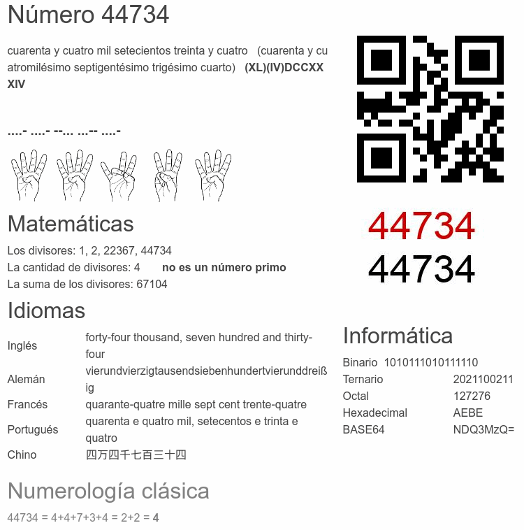 Si conoce algo interesante sobre el número 44734 o cualquier número natural (entero positivo), por favor escríbanos.Número 44 734 en otras unidades