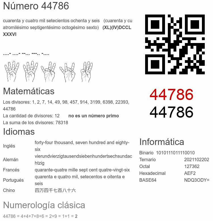 Si conoce algo interesante sobre el número 44786 o cualquier número natural (entero positivo), por favor escríbanos.Número 44 786 en otras unidades