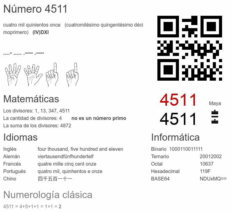 | Francés: | 🔊 (nombre 4 511) | quatre mille cinq cent onze |