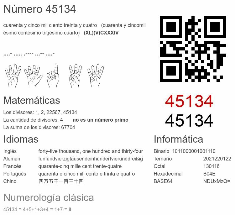 El número par 45 134 se dice 🔊, y se escribe con las palabras: cuarenta y cinco mil ciento treinta y cuatro. El número ordinal 45134.° se dice 🔊 y se escribe como: cuarenta y cincomilésimo centésimo trigésimo cuarto. El significado del número 45134 en Matemáticas: Es un primo? Factorización y árbol de factores primos. La raíz cuadrada de y la raíz cúbica de 45134. El significado en informática, numerología, códigos e imágenes, escritura y denominación en otras lenguas. Otras curiosidades relacionadas con el 45134.