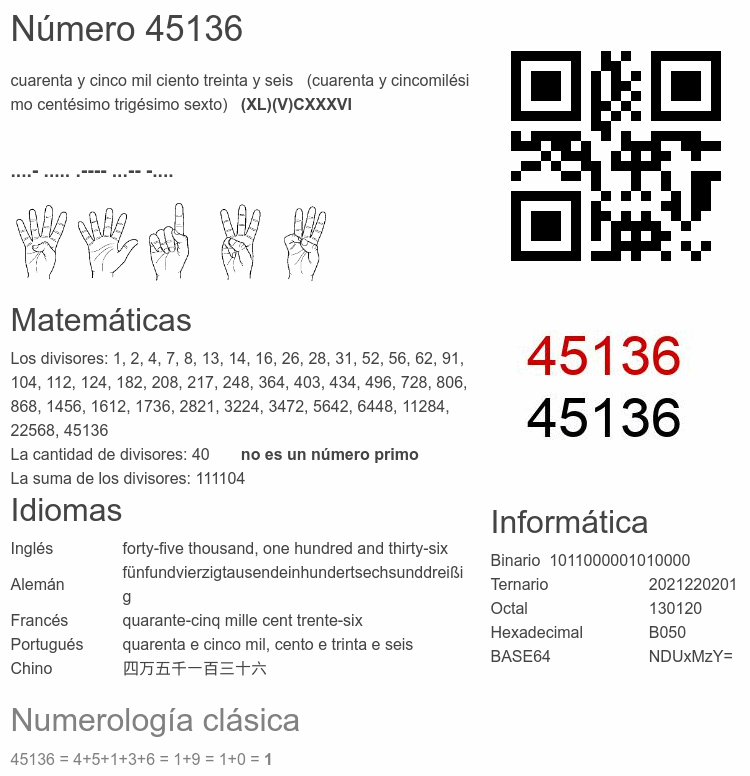 El número par 45 136 se dice 🔊, y se escribe con las palabras: cuarenta y cinco mil ciento treinta y seis. El número ordinal 45136.° se dice 🔊 y se escribe como: cuarenta y cincomilésimo centésimo trigésimo sexto. El significado del número 45136 en Matemáticas: Es un primo? Factorización y árbol de factores primos. La raíz cuadrada de y la raíz cúbica de 45136. El significado en informática, numerología, códigos e imágenes, escritura y denominación en otras lenguas. Otras curiosidades relacionadas con el 45136.