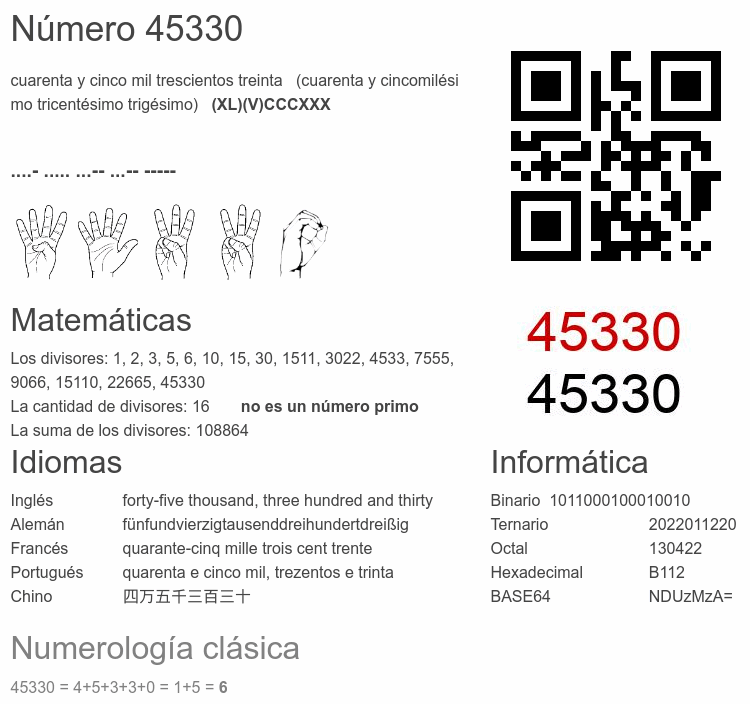 Si conoce algo interesante sobre el número 45330 o cualquier número natural (entero positivo), por favor escríbanos.Número 45 330 en otras unidades