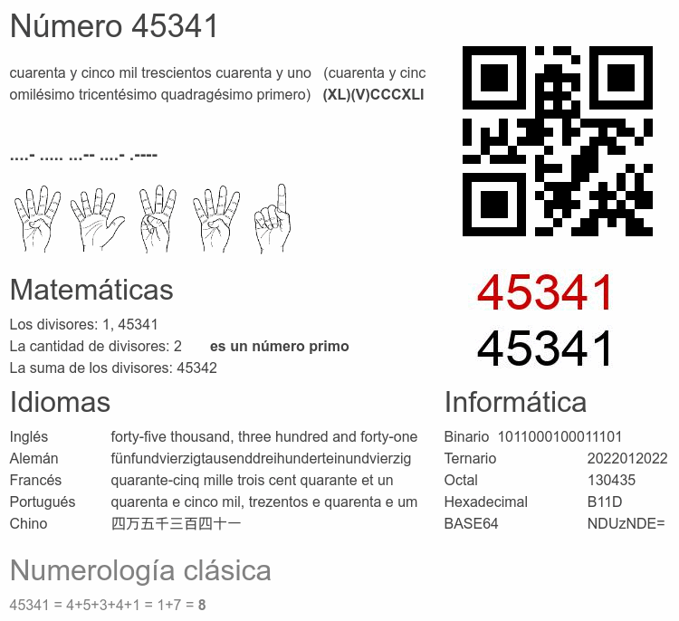 Si conoce algo interesante sobre el número 45341 o cualquier número natural (entero positivo), por favor escríbanos.Número 45 341 en otras unidades