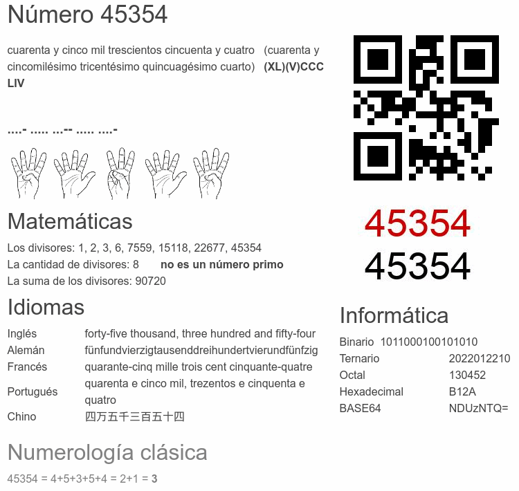 Si conoce algo interesante sobre el número 45354 o cualquier número natural (entero positivo), por favor escríbanos.Número 45 354 en otras unidades