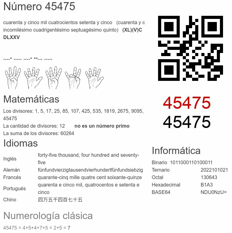 El número impar 45 475 se dice 🔊, y se escribe con las palabras: cuarenta y cinco mil cuatrocientos setenta y cinco. El número ordinal 45475.° se dice 🔊 y se escribe como: cuarenta y cincomilésimo cuadrigentésimo septuagésimo quinto. El significado del número 45475 en Matemáticas: Es un primo? Factorización y árbol de factores primos. La raíz cuadrada de y la raíz cúbica de 45475. El significado en informática, numerología, códigos e imágenes, escritura y denominación en otras lenguas. Otras curiosidades relacionadas con el 45475.