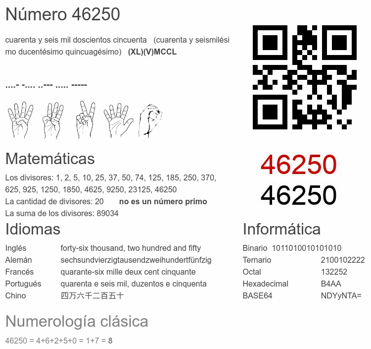 Si conoce algo interesante sobre el número 46250 o cualquier número natural (entero positivo), por favor escríbanos.Número 46 250 en otras unidades