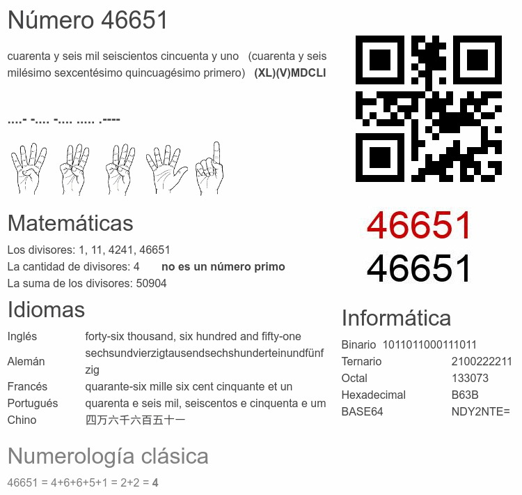 Si conoce algo interesante sobre el número 46651 o cualquier número natural (entero positivo), por favor escríbanos.Número 46 651 en otras unidades