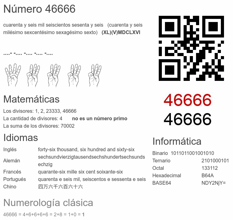 El número par 46 666 se dice 🔊, y se escribe con las palabras: cuarenta y seis mil seiscientos sesenta y seis. El número ordinal 46666.° se dice 🔊 y se escribe como: cuarenta y seismilésimo sexcentésimo sexagésimo sexto. El significado del número 46666 en Matemáticas: Es un primo? Factorización y árbol de factores primos. La raíz cuadrada de y la raíz cúbica de 46666. El significado en informática, numerología, códigos e imágenes, escritura y denominación en otras lenguas. Otras curiosidades relacionadas con el 46666.