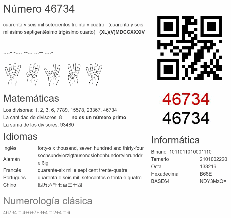 Si conoce algo interesante sobre el número 46734 o cualquier número natural (entero positivo), por favor escríbanos.Número 46 734 en otras unidades