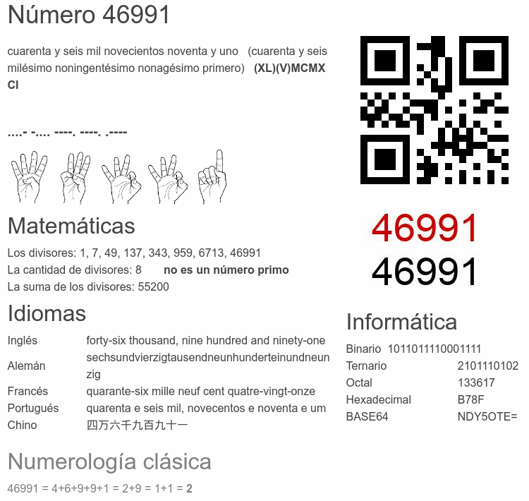 Si conoce algo interesante sobre el número 46991 o cualquier número natural (entero positivo), por favor escríbanos.Número 46 991 en otras unidades