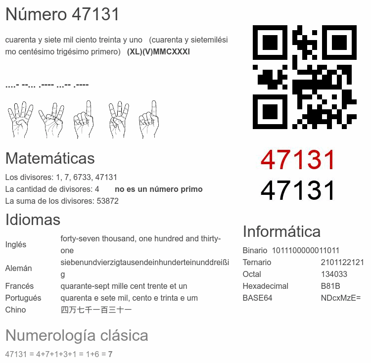 El número impar 47 131 se dice 🔊, y se escribe con las palabras: cuarenta y siete mil ciento treinta y uno. El número ordinal 47131.° se dice 🔊 y se escribe como: cuarenta y sietemilésimo centésimo trigésimo primero. El significado del número 47131 en Matemáticas: Es un primo? Factorización y árbol de factores primos. La raíz cuadrada de y la raíz cúbica de 47131. El significado en informática, numerología, códigos e imágenes, escritura y denominación en otras lenguas. Otras curiosidades relacionadas con el 47131.