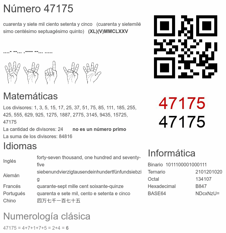 Si conoce algo interesante sobre el número 47175 o cualquier número natural (entero positivo), por favor escríbanos.Número 47 175 en otras unidades