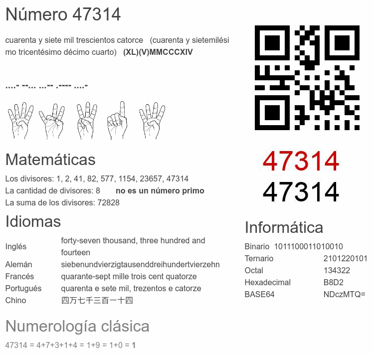 Si conoce algo interesante sobre el número 47314 o cualquier número natural (entero positivo), por favor escríbanos.Número 47 314 en otras unidades
