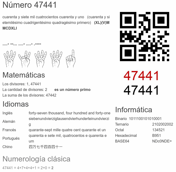 El numero 47441 es un número primo. Los números primos más cercanos son 47431, 47459.