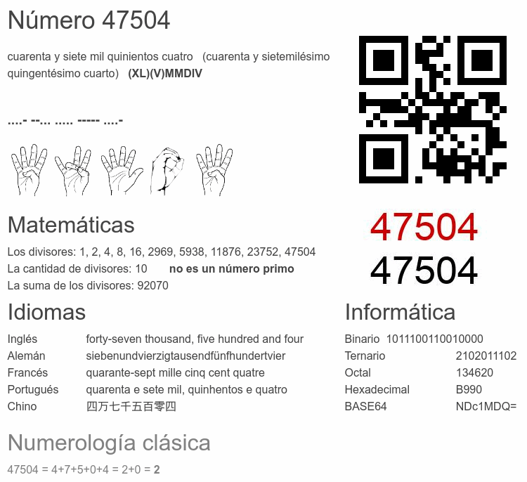 Si conoce algo interesante sobre el número 47504 o cualquier número natural (entero positivo), por favor escríbanos.Número 47 504 en otras unidades