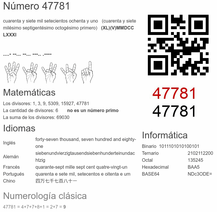 Si conoce algo interesante sobre el número 47781 o cualquier número natural (entero positivo), por favor escríbanos.Número 47 781 en otras unidades