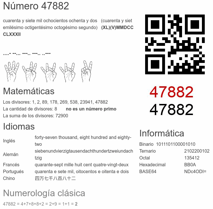 | Francés: | 🔊 (nombre 47 882) | quarante-sept mille huit cent quatre-vingt-deux |