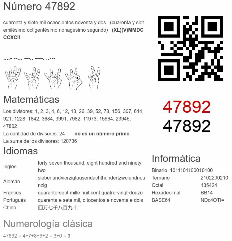 Si conoce algo interesante sobre el número 47892 o cualquier número natural (entero positivo), por favor escríbanos.Número 47 892 en otras unidades
