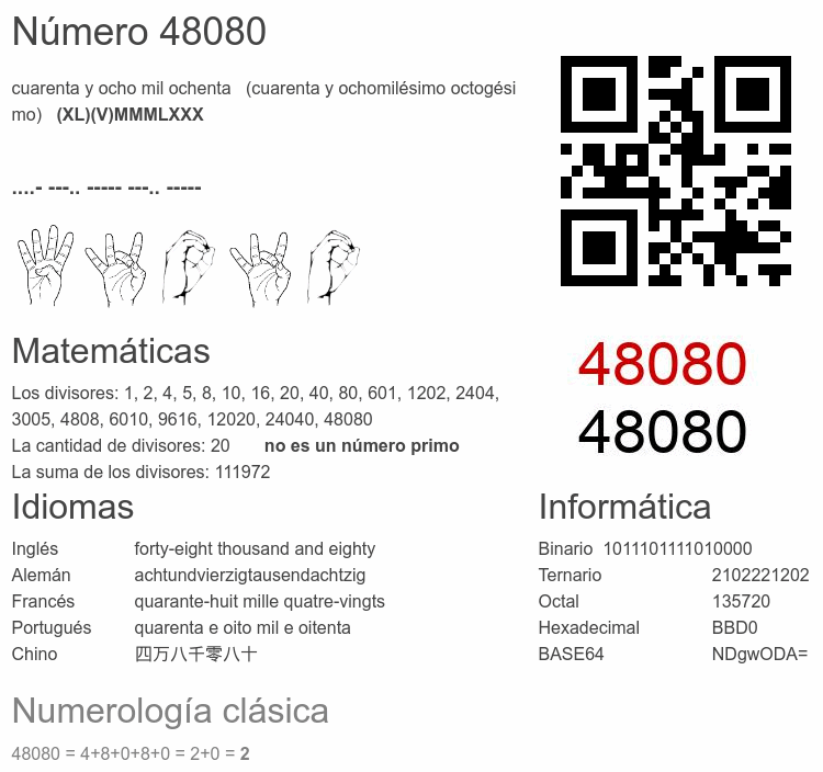 | Japonés: | 🔊 (数 48,080) | 四万八千八十 |