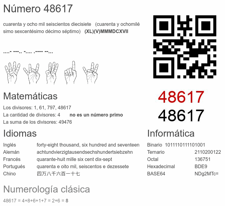 Si conoce algo interesante sobre el número 48617 o cualquier número natural (entero positivo), por favor escríbanos.Número 48 617 en otras unidades