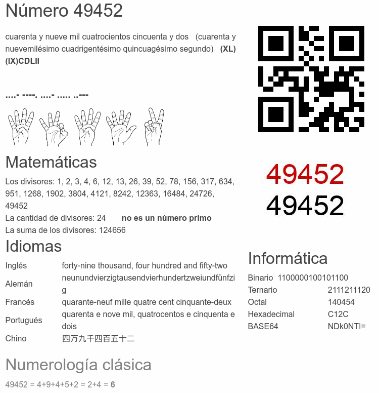 Si conoce algo interesante sobre el número 49452 o cualquier número natural (entero positivo), por favor escríbanos.Número 49 452 en otras unidades