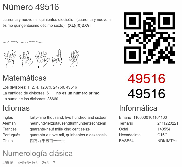 Si conoce algo interesante sobre el número 49516 o cualquier número natural (entero positivo), por favor escríbanos.Número 49 516 en otras unidades