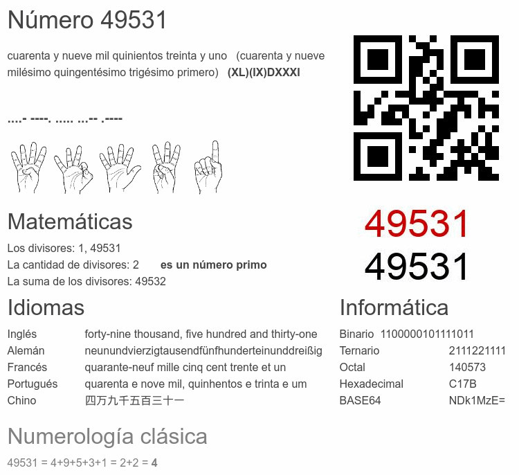 Si conoce algo interesante sobre el número 49531 o cualquier número natural (entero positivo), por favor escríbanos.Número 49 531 en otras unidades