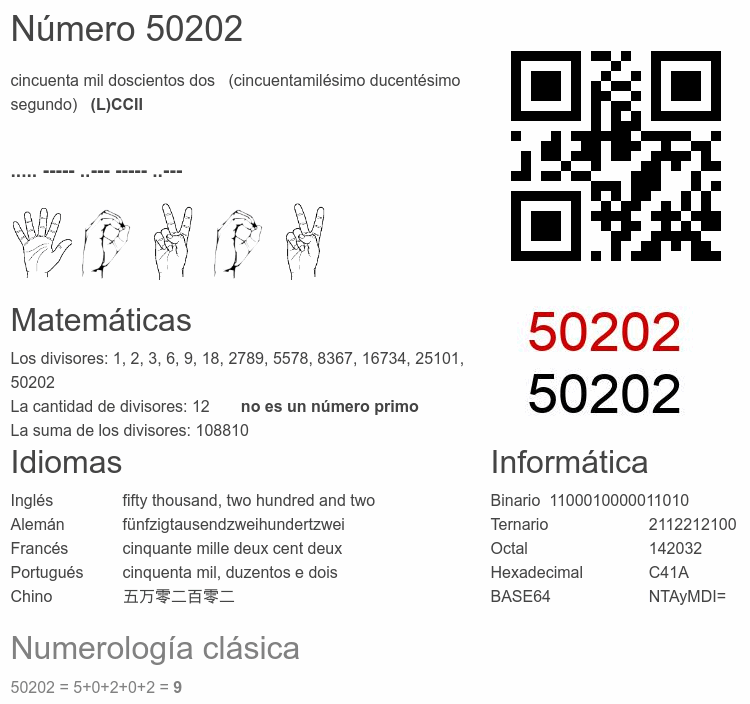 Si conoce algo interesante sobre el número 50202 o cualquier número natural (entero positivo), por favor escríbanos.Número 50 202 en otras unidades