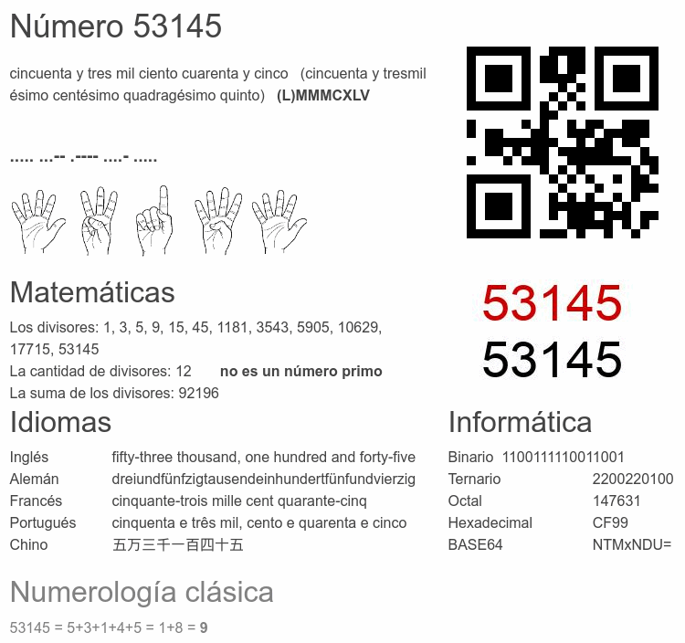 Si conoce algo interesante sobre el número 53145 o cualquier número natural (entero positivo), por favor escríbanos.Número 53 145 en otras unidades