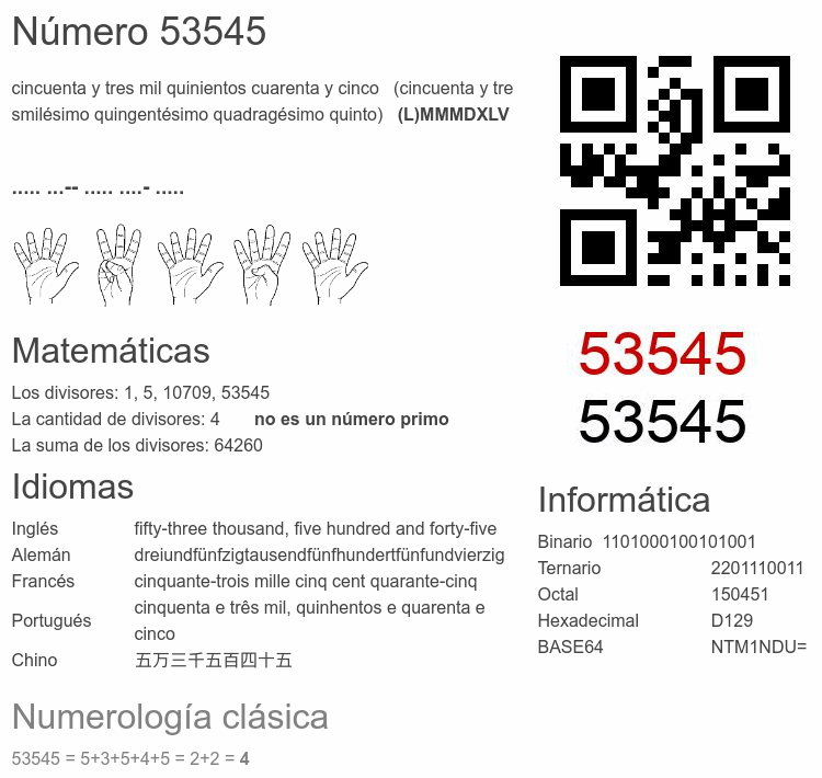 Si conoce algo interesante sobre el número 53545 o cualquier número natural (entero positivo), por favor escríbanos.Número 53 545 en otras unidades