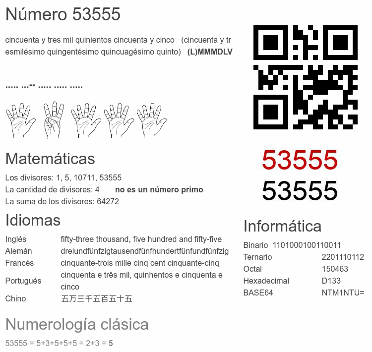 Si conoce algo interesante sobre el número 53555 o cualquier número natural (entero positivo), por favor escríbanos.Número 53 555 en otras unidades