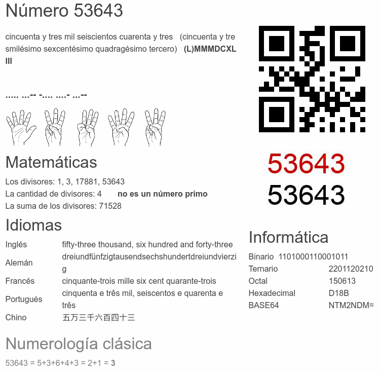 Si conoce algo interesante sobre el número 53643 o cualquier número natural (entero positivo), por favor escríbanos.Número 53 643 en otras unidades