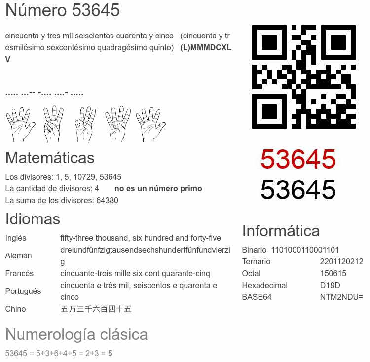 Si conoce algo interesante sobre el número 53645 o cualquier número natural (entero positivo), por favor escríbanos.Número 53 645 en otras unidades