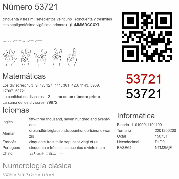 Si conoce algo interesante sobre el número 53721 o cualquier número natural (entero positivo), por favor escríbanos.Número 53 721 en otras unidades