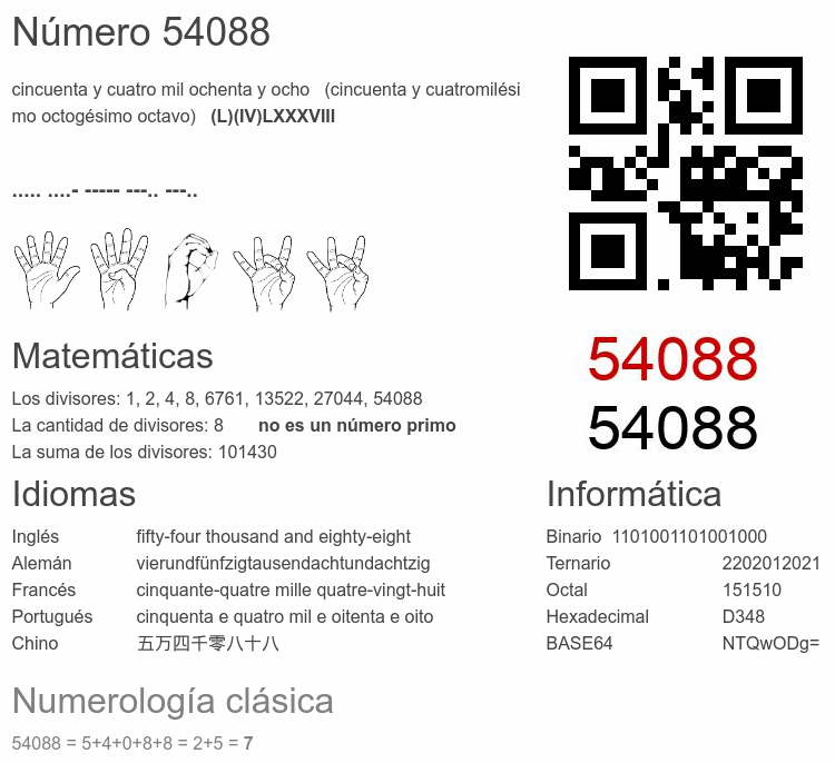 | Japonés: | 🔊 (数 54,088) | 五万四千八十八 |