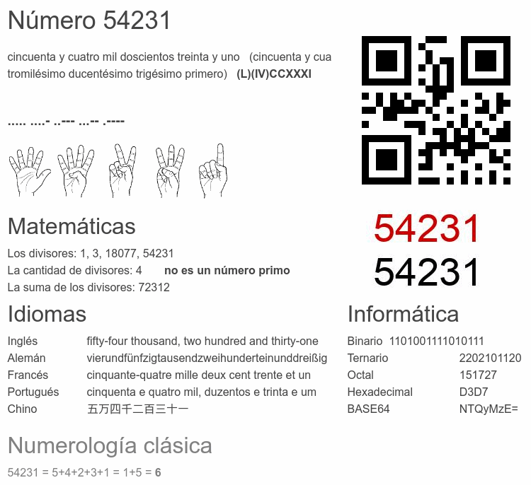Si conoce algo interesante sobre el número 54231 o cualquier número natural (entero positivo), por favor escríbanos.Número 54 231 en otras unidades