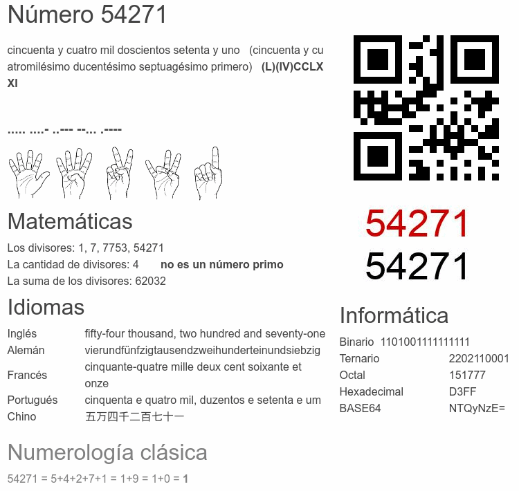 Si conoce algo interesante sobre el número 54271 o cualquier número natural (entero positivo), por favor escríbanos.Número 54 271 en otras unidades