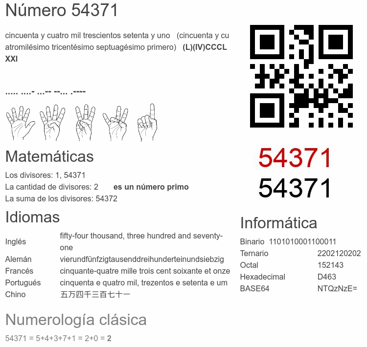 Si conoce algo interesante sobre el número 54371 o cualquier número natural (entero positivo), por favor escríbanos.Número 54 371 en otras unidades
