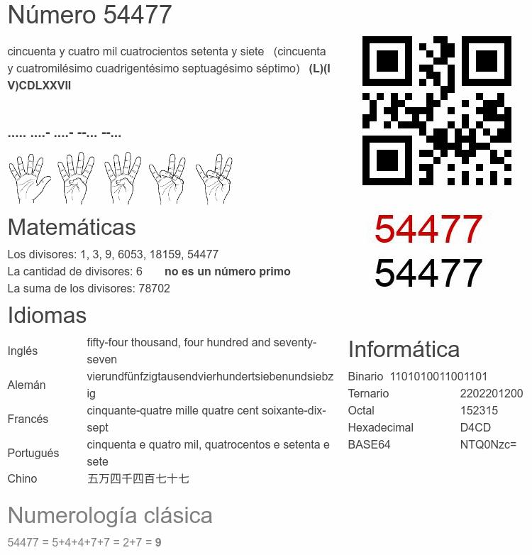 Si conoce algo interesante sobre el número 54477 o cualquier número natural (entero positivo), por favor escríbanos.Número 54 477 en otras unidades