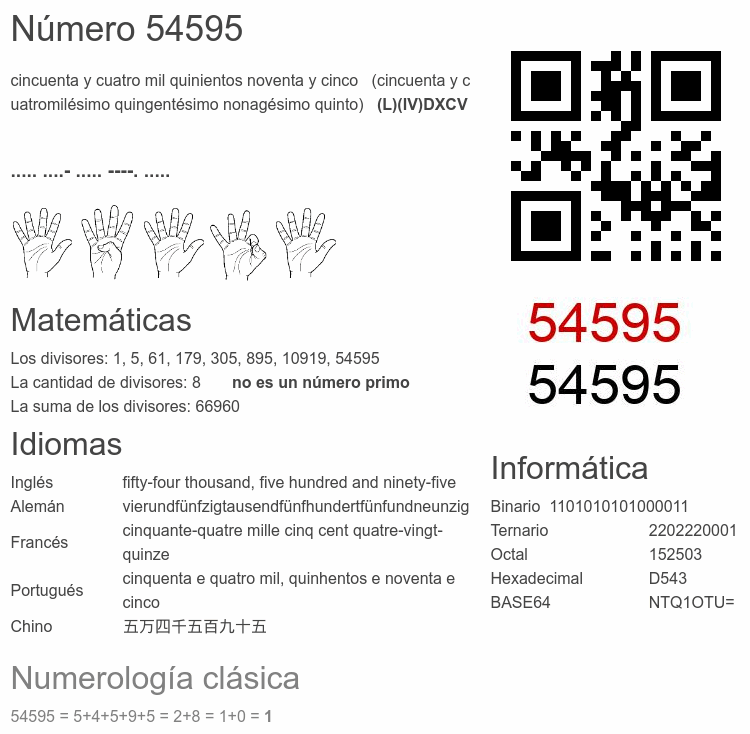 Si conoce algo interesante sobre el número 54595 o cualquier número natural (entero positivo), por favor escríbanos.Número 54 595 en otras unidades