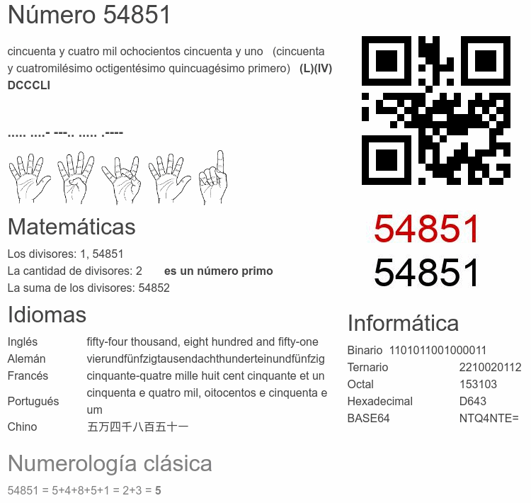 Si conoce algo interesante sobre el número 54851 o cualquier número natural (entero positivo), por favor escríbanos.Número 54 851 en otras unidades