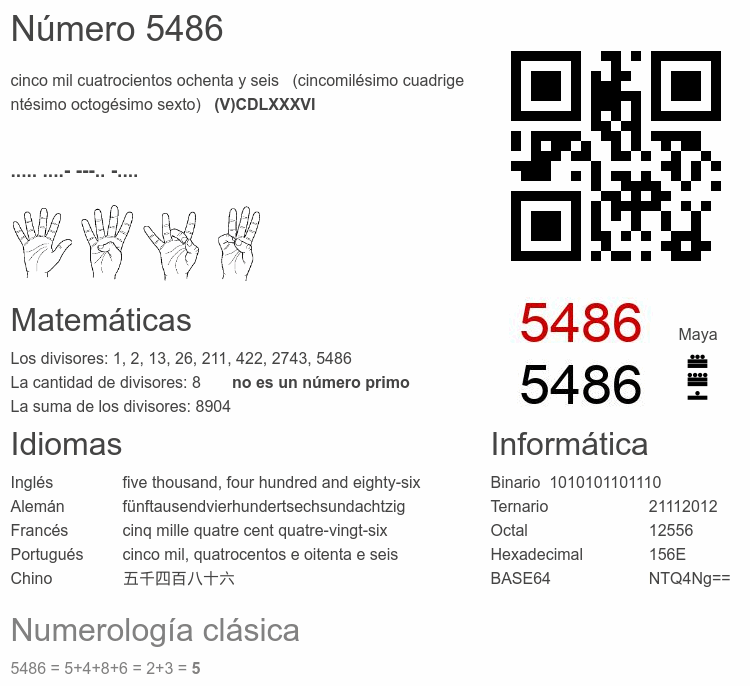 | Hebreo: | (מספר 5,486) | חמשת אלפים ארבע מאות שמונים ושש |