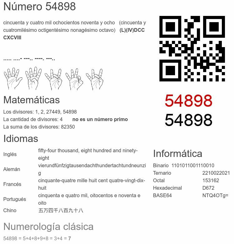 Si conoce algo interesante sobre el número 54898 o cualquier número natural (entero positivo), por favor escríbanos.Número 54 898 en otras unidades