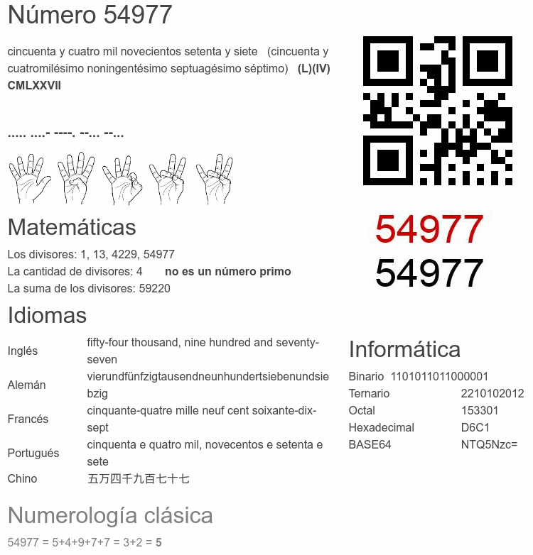 Si conoce algo interesante sobre el número 54977 o cualquier número natural (entero positivo), por favor escríbanos.Número 54 977 en otras unidades