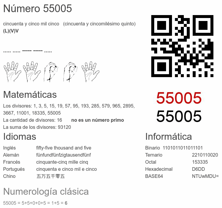 Si conoce algo interesante sobre el número 55005 o cualquier número natural (entero positivo), por favor escríbanos.Número 55 005 en otras unidades