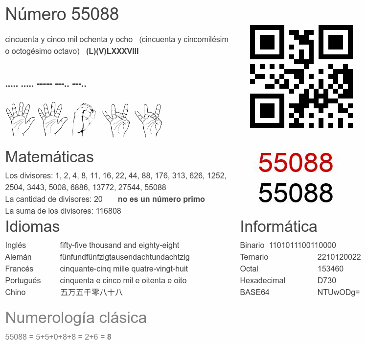 | Japonés: | 🔊 (数 55,088) | 五万五千八十八 |