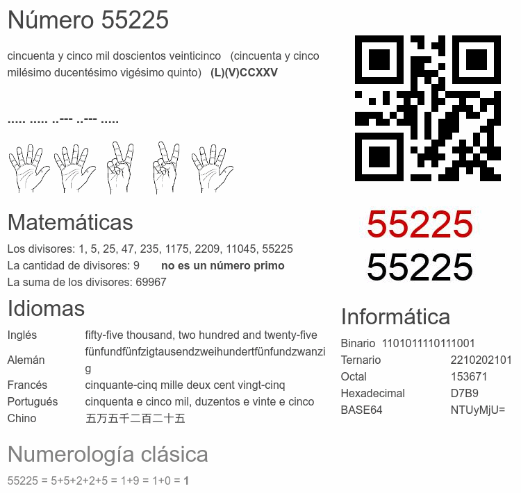 Si conoce algo interesante sobre el número 55225 que no ha encontrado en esta página, no dude en escríbanos aqui.