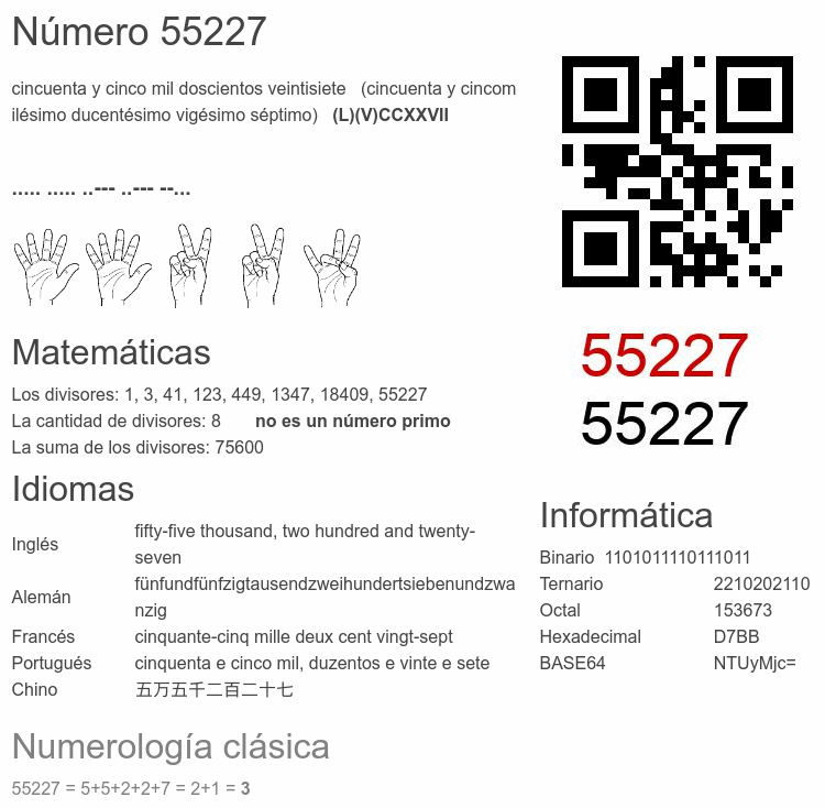 Si conoce algo interesante sobre el número 55227 o cualquier número natural (entero positivo), por favor escríbanos.Número 55 227 en otras unidades